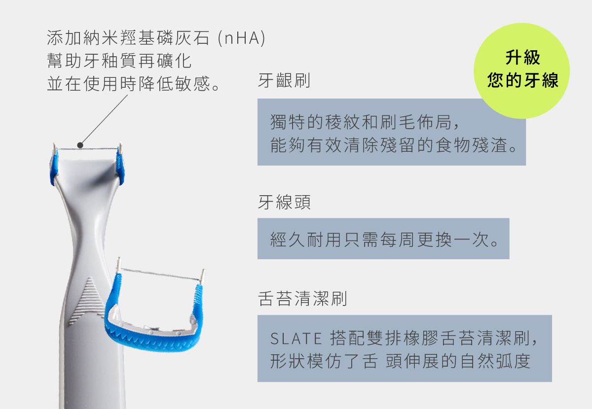 多數人只在「牙膏」中體驗過 nHA,但 SLATE 將這個頂級材質的應用推向了全新的層次——我們將 nHA 融入了每天都要使用的「牙線頭」中。