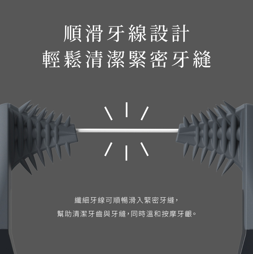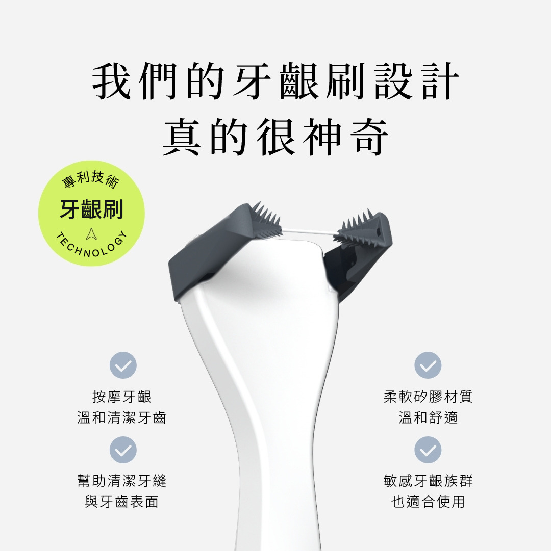 我們專利牙齦刷(Gum Brushes™)能深入牙齦與牙齒周圍進行按摩、刺激並有效清潔。其特殊設計的肋條與細緻刷毛能掃除牙刷無法觸及的牙菌斑與食物殘渣。使用方式也很簡單:在使用牙線時,只需將牙線頭沿著牙齒前後方向輕鬆來回滑動,即可完成清潔!