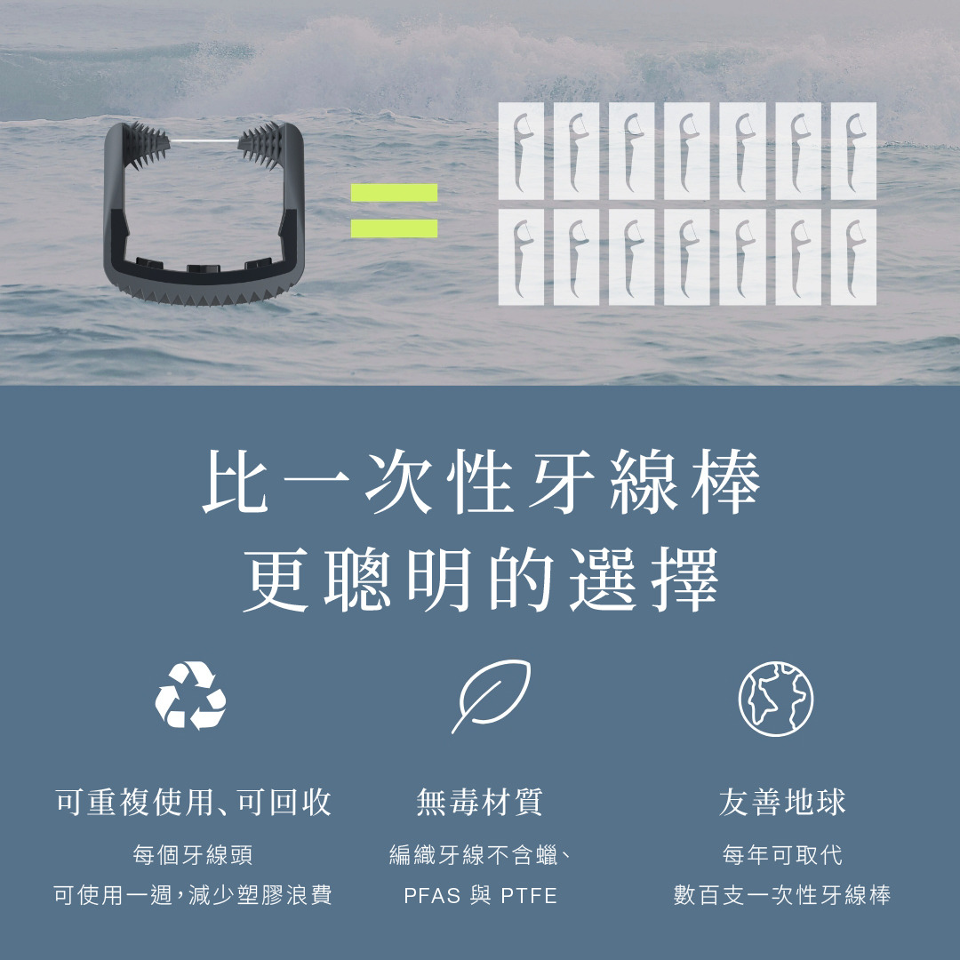 我們的編織牙線採用 450 條高強度纖維製成,材質不含 Teflon、PTFE 或 PFAS,使用安心、耐用。