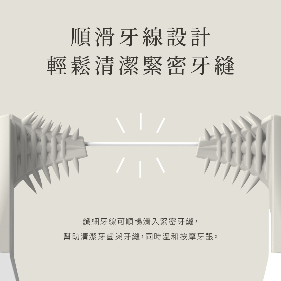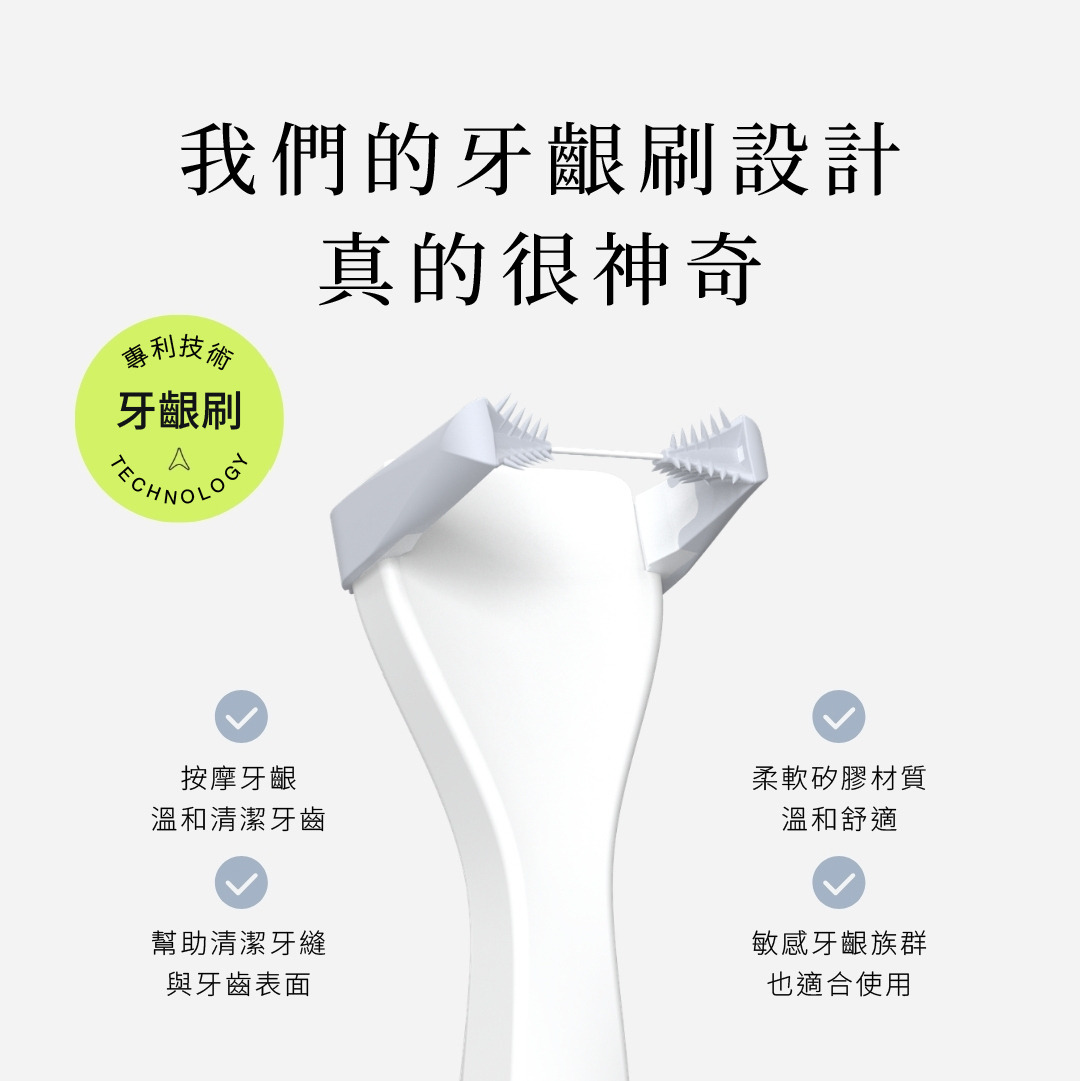 我們專利牙齦刷(Gum Brushes™)能深入牙齦與牙齒周圍進行按摩、刺激並有效清潔。其特殊設計的肋條與細緻刷毛能掃除牙刷無法觸及的牙菌斑與食物殘渣。使用方式也很簡單:在使用牙線時,只需將牙線頭沿著牙齒前後方向輕鬆來回滑動,即可完成清潔!