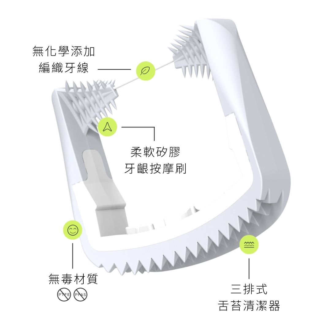 Slate 多功能電動牙線器配備雙列橡膠刷舌器,能輕柔地提起並清掃舌面堆積的雜質,最後再透過直式刮片將不需要的殘留物一併帶走。整個清潔器的形狀也依照舌頭自然伸展時的弧度設計,讓清潔動作更貼合、更容易上手。